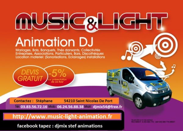 Music & light animations, nous animons toutes vos soirées,bals,mariages,anniversaires,thés dansants,banquets,.......location de materiel de sonorisation et d'éclairages,installation et désinstallation par nos soins, informations et devis gratuit.