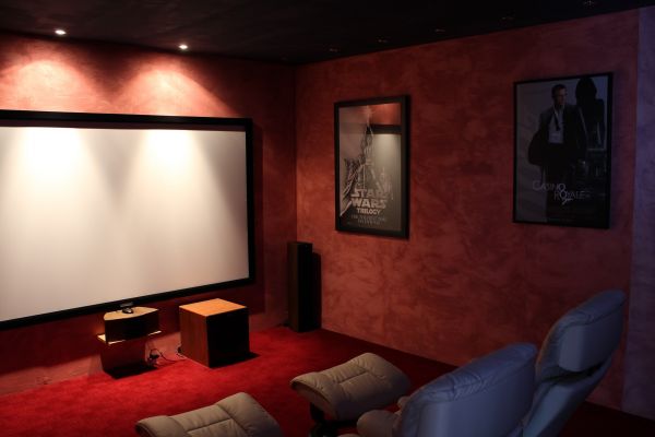 1 salle privative de 17m2 , équipée home cinéma avec estrade, 6 fauteuils de cinéma , 1 vidéoprojecteur , 1 écran vidéo de 2,40m de base , isolation acoustique et spot à led bleue, donnant sur le salon .