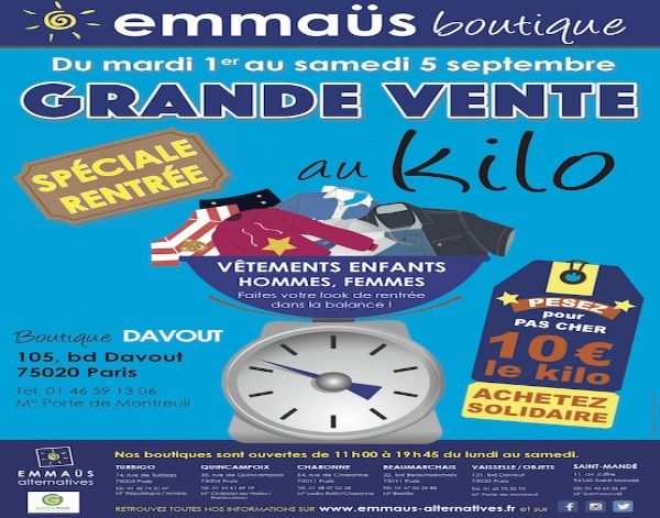 l’association emmaüs alternatives organise pour sa rentrée automnale, la grande vente de vêtements au kilo à paris : pour tous, hommes, femmes, enfants, retrouvez des vêtements tendance, vintage, classiques ou encore sport… à la portée de toutes les bourses, pour 10 euros le kilo !