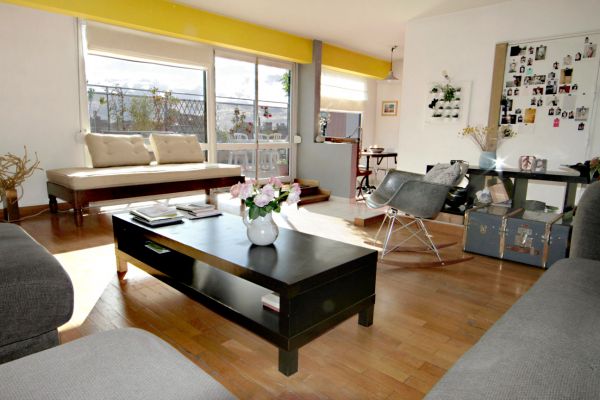vaste salon, coin repas et cuisine ouvrant sur la terrasse
